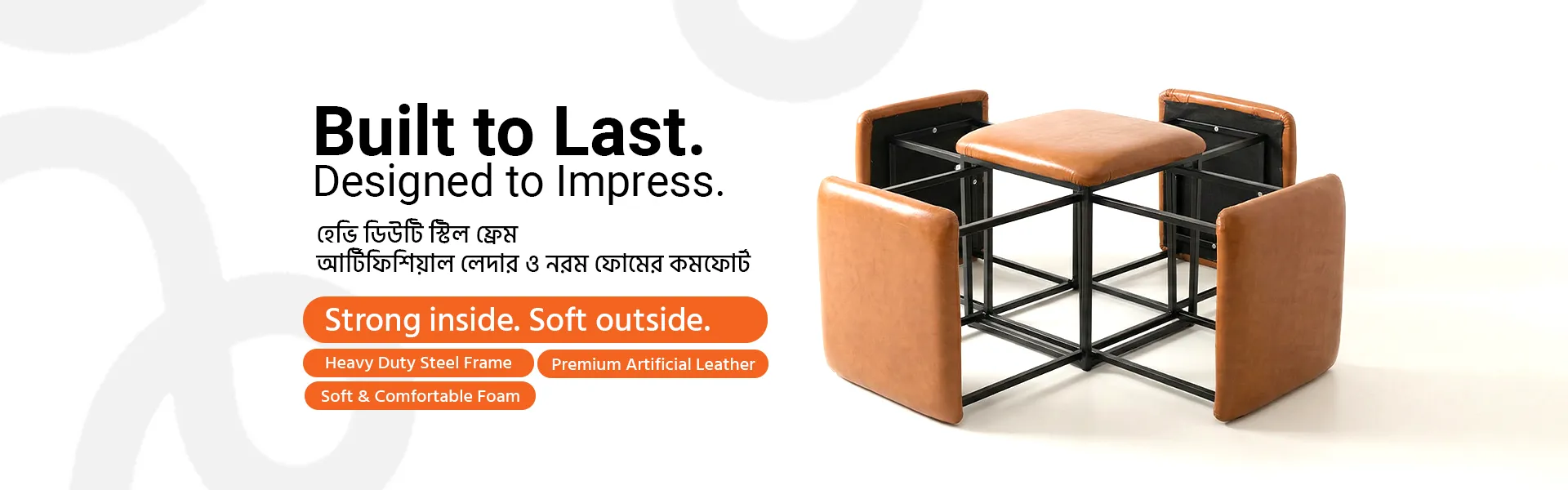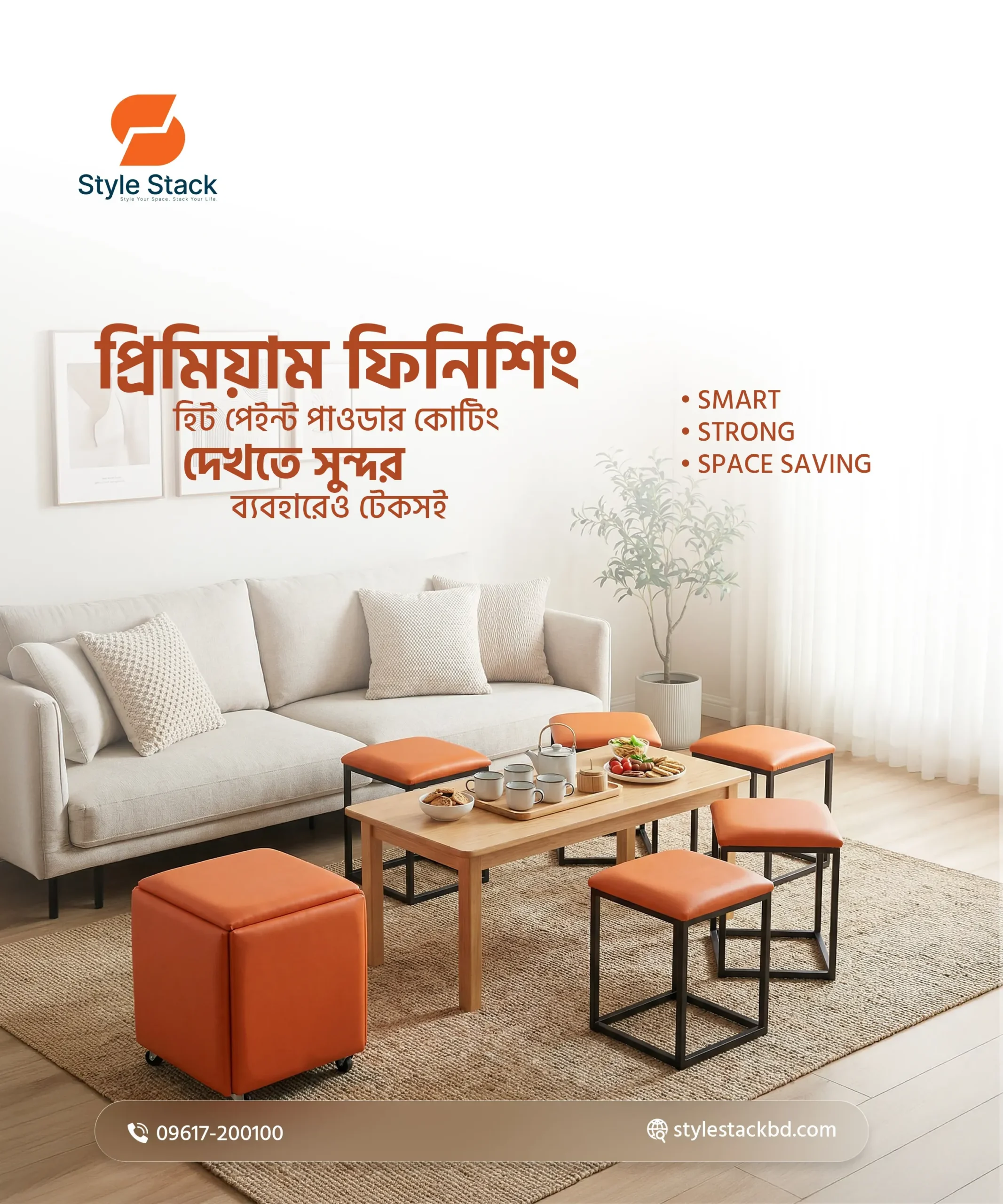 এছাড়াও আমাদের কাছে আছে কিছু স্মার্ট ফার্নিচার — যেমন ড্রেসিং মিরর ওয়ারড্রোব স্ট্যান্ড, ল্যাপটপ টেবিল, অটোমান চেয়ার সেট — যেগুলো একসাথে একাধিক কাজে ব্যবহার করা যায় এবং আপনার ঘরকে আরও modern look দেয়।