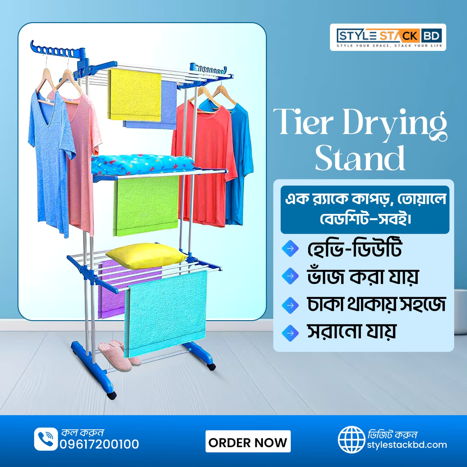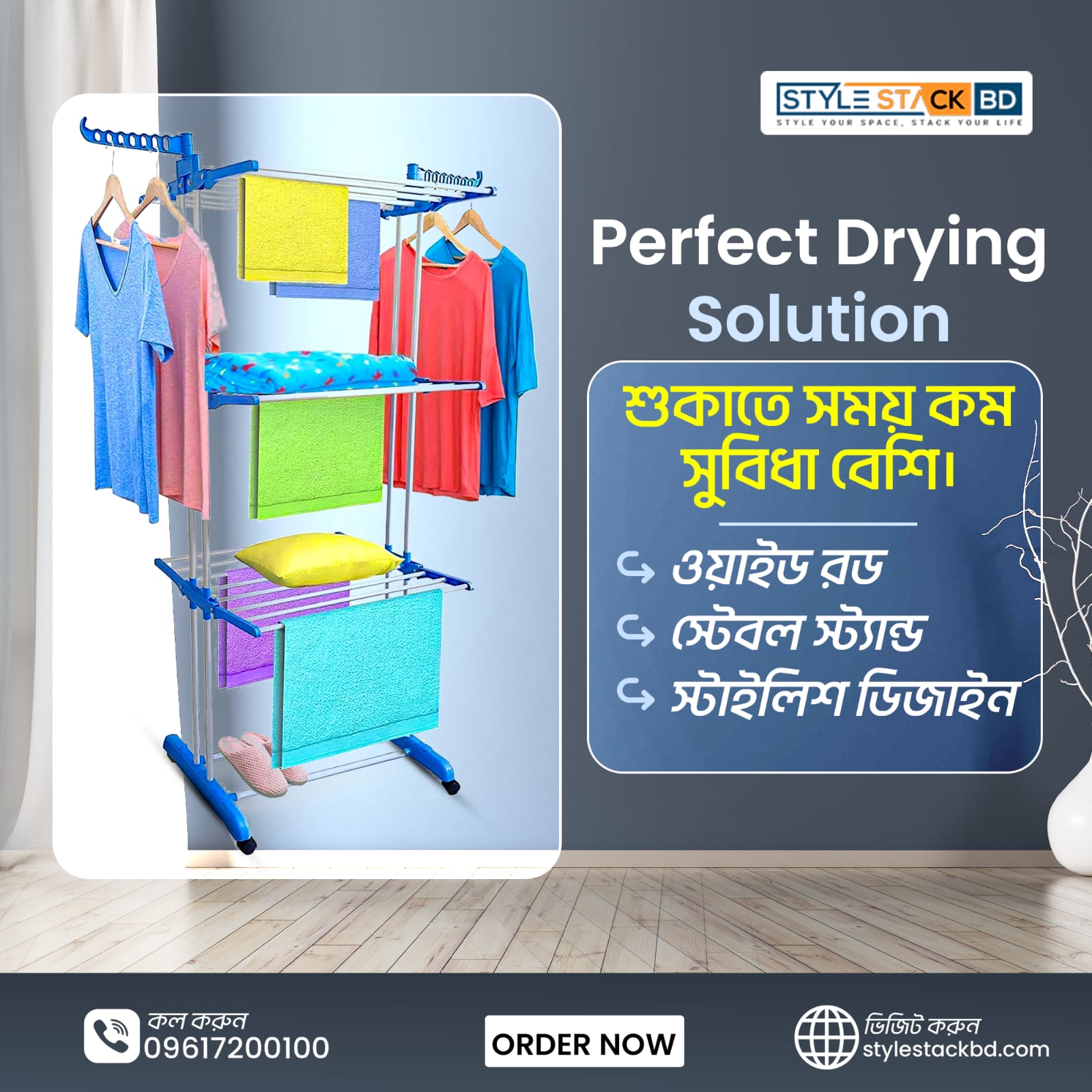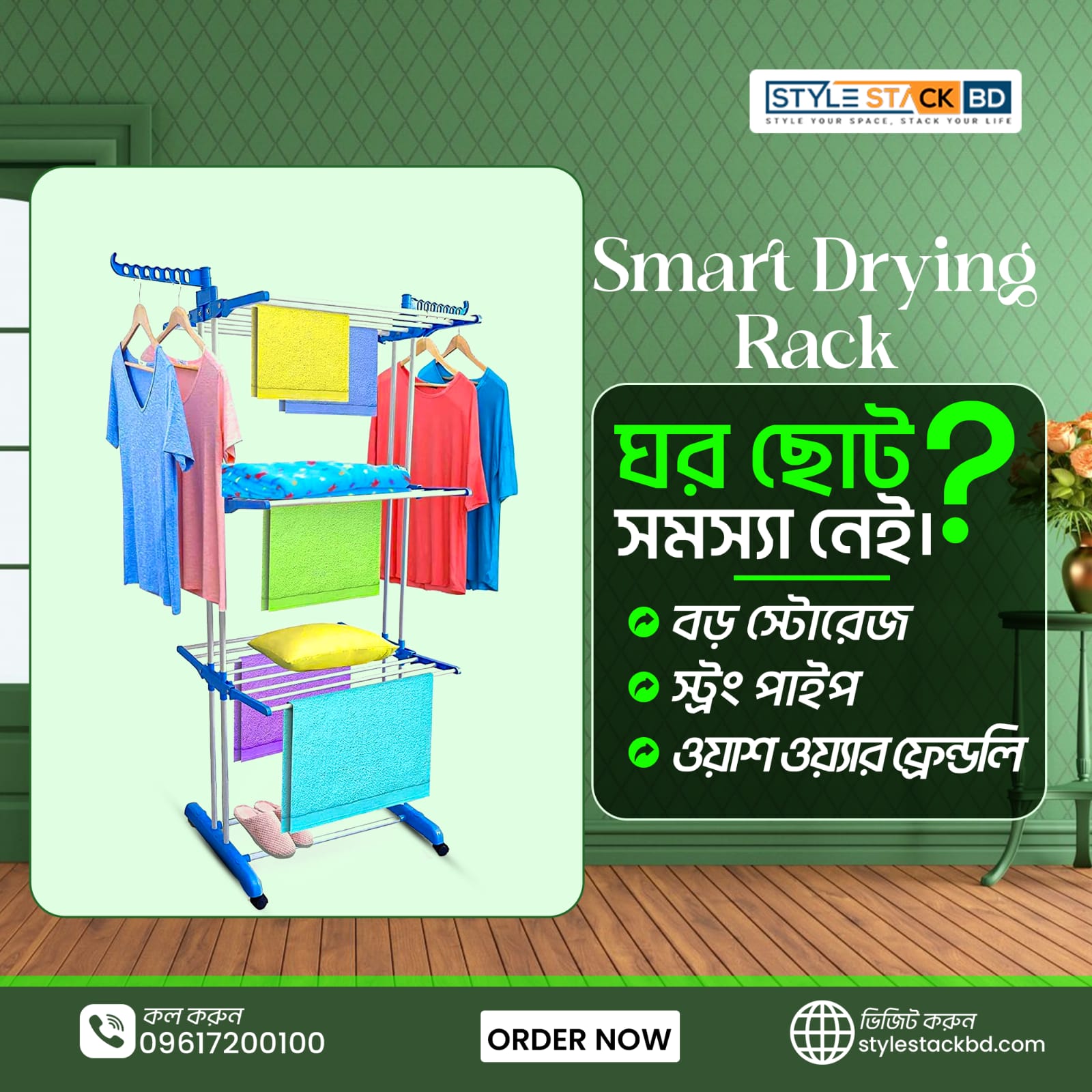 এই Multi-Layer Foldable Drying Rack–টি বিশেষভাবে ডিজাইন করা হয়েছে যাতে ছোট বা বড়—যে কোনো বাসায় সহজেই ব্যবহার করা যায়।